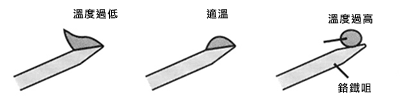 锡是低温易熔及易老化的焊料,温度低时,锡呈现胶状不黏,令线路 板的铜箔与零件脚造成假焊。温度正确适中时,在焊咀的锡呈半圆粒状,有反光面,是黏着力最佳的时候,迅速将零件脚与底板电路焊接。温度过高时,锡呈圆粒 状,锡点表面的色泽呈哑色,有绉纹,表示锡已老化,会造成假焊点出现。所以,从铬铁咀的锡粒形状可知何时焊接是最好的时候,制作的成功率是怎样。