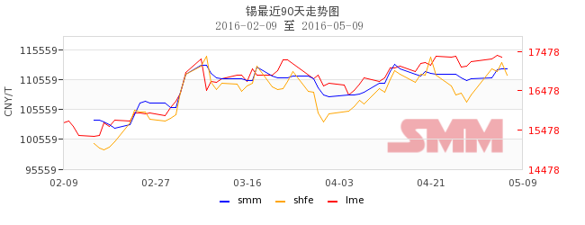SMM锡简评:今日开盘112340元/吨,受到周末公布的中国4月对外贸易数据疲弱的打压,国内商品市场普遍遭遇重挫,沪期锡主力一路震荡下行,最低触及110030 元/吨,最终收盘110770元/吨,较前一日下跌590元/吨,跌幅0.53%。成交33068手减8242手,持仓10624手减242手。