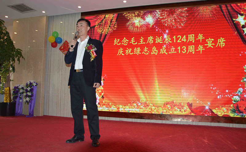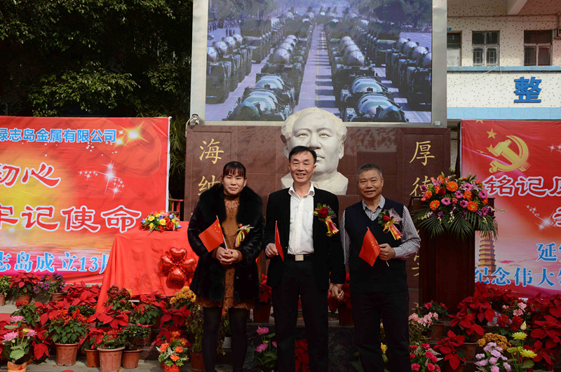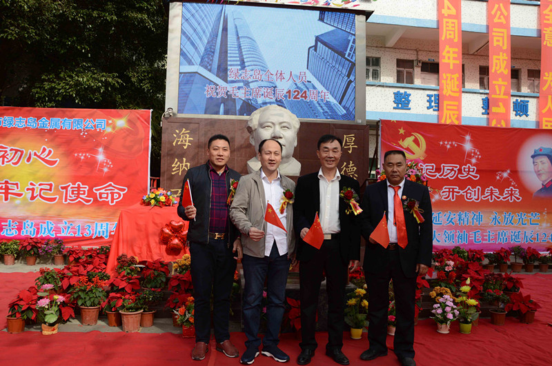绿志岛实业由来自湖南的朱祖生先生创业于2000年,由最初的锡渣冶炼厂经过十来年的艰苦奋斗,现在公司产品包括焊锡条、焊锡丝、焊锡膏,助焊剂,清洗剂,防锈剂,润滑油等。绿志岛实业的发展,在以毛主席思想为信仰的指引下突飞猛进,在“吃水不忘挖井人”的感恩心下稳步发展。为了巩固毛主席思想作为绿志岛的信仰核心,绿志岛于2012年12月26日从泰山迎接来毛主席泰山石像,并立于公司内部。自此,绿志岛每年12月26日都会齐聚众多认同毛主席的朋友,在绿志岛内缅怀纪念毛主席。2017年是绿志岛举办毛主席诞辰第六年,为此和志同道合的朋友们齐聚一堂,共庆毛主席诞辰。