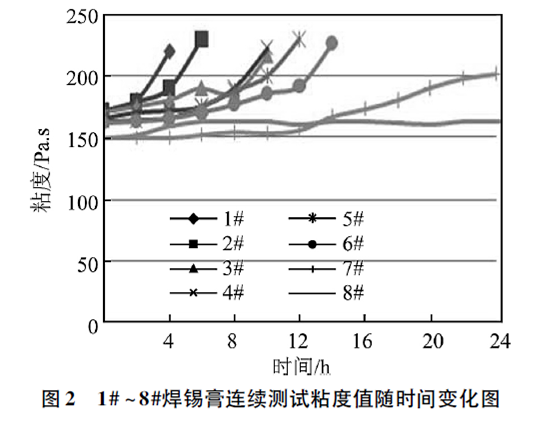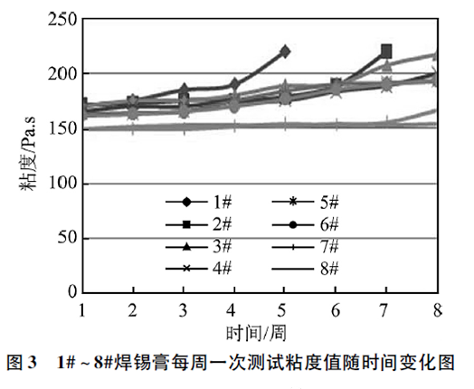 从图3看出,1#、2#焊锡膏连续测试不到8周砂化,3#~8#焊锡膏在8周测试时间内未砂化,但3#~6#焊锡膏粘度变化较大,粘度变化超过20%,不利于焊锡膏印刷使用。7#、8#焊锡膏粘度值稳定,保质期较长。