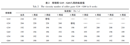 焊锡膏G1# ~ G6#每周一次的粘度值如表2 所示,从表2 看出G1#、G2#焊锡膏的初始粘度较G3# ~ G6#高,G1#两周后砂化,G2#四周后砂化,G3# ~ G6#在八周内的粘度保持稳定。
