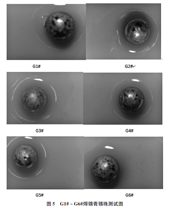分析焊锡膏G1# ~ G6#所对应的焊锡粉F1# ~F6#,其氧含量依次升高,F1#最低50 mg /kg,F6#最高130 mg /kg。由表1、表2 得出焊锡粉氧含量对焊锡膏粘度稳定性有一定的影响,焊锡粉氧含量在80 ~ 120 mg /kg 时焊锡膏的稳定性较好。按照IPC - TM - 650 2. 4. 43 的试验方法,以陶瓷片为载体对G1# ~ G6#进行了锡珠试验,试验结果如图5所示。从图5 看出G1#焊点周边没有小锡珠,G2#、G3#、G4#焊点周边出现了小于5 个的小锡珠,G5#焊点周边出现了大于10 个的小锡珠、G6 #焊点周边出现无数锡珠。由此推断当氧含量超过120 mg /kg 时,焊锡膏稳定性虽好,但是焊点周围产生大量小锡珠。