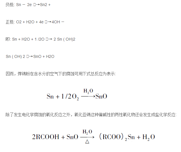 焊锡中除Sn 外还含有Ag、Cu ( 或其他元素)等相比较高电位的金属,在有助焊剂介质的作用下,形成无数个以Sn 为负极、Ag /Cu 等为正极的原电池,这就会发生如下反应: